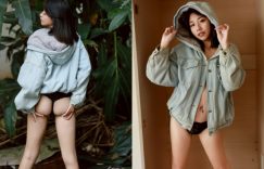 屁股控看過來,這樣的背殺可是前所未有!眼前穿著藍色外套的妹子就是「米果Migo」,上面過著冬天,下面過夏天,褲子直接失蹤剩下黑色的丁字褲,小手往後邊肉肉一提真是不得了,渾圓有肉的屁屁就這樣衝擊了大家的視線,銷魂的臀肉搭上美腿,還不用轉身就已殺遍滿江! (