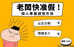 小時候,生日願望總是希望自己快快長大。現在終於長大,生日願望卻常含淚的對長大的世界苦笑。台灣普遍工作環境很逼人,拿到offer的快感比不上三個月後的失落感。工作好悶→錢好少→不得不做→繼續悶→錢依然好少。世間有多少花樣男女正被這惡性循環摧殘著?覺得現在的工作搞得自己身心俱疲?來,你現在要做的就是:休息。沒看錯,就是好好的休息,重新擁抱私生活,好好運動、睡覺,好好陪伴家人、朋友、情人,不需要設 KPI,單純的陪伴就是最好的達標。老闆,你好壞,我好累。好想休息,只好這麼做了…個人專屬請假外掛