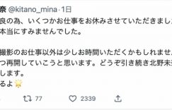 这是北野未奈昨天的发文,意思是说因为身体病痛的缘故,她向事务所请了个假,除了对片商及合作的厂商感到抱歉外也承诺自己会一点一点地恢复,将来,她会恢复成原来的北野未奈: