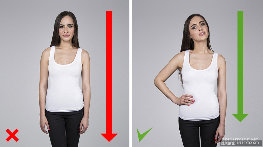 ▼就這樣站的直直,其實會拉壞身材的比例,也顯得沒自信喔~還是像女神這樣手插腰,臉輕輕往側邊上看,會讓人放更多重點在你的身材!