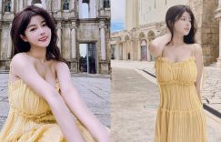 最近去港澳旅遊的人真的滿多的~畢竟距離很近也不用舟車勞頓,還有許多知名景點可以拍美照,是不少正妹愛去的地方!JKF女郎「小花姐接」前往澳門玩,就在超多人熱愛拍照的大三巴前面留下許多美照,一頭飄逸長髮和鵝黃色的細肩帶小洋裝,展現出小花姐接甜美清新的氣質,尤其是雪白的香肩鎖骨,以及豐滿的雪乳和深邃乳溝,稍微一彎腰就快看光光啦。 (